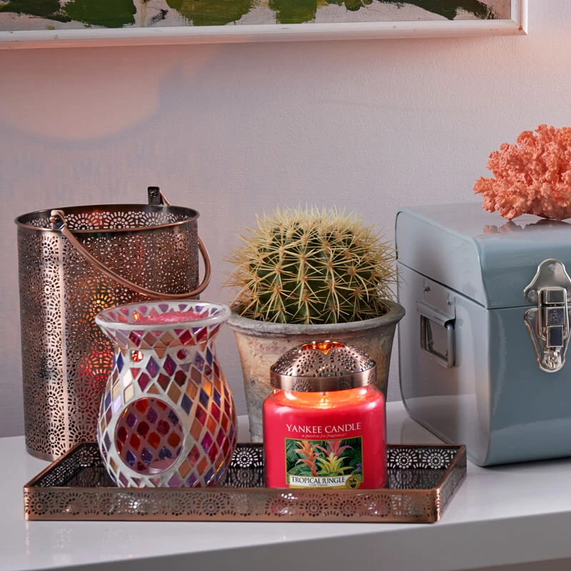 La Giara Media Tropical Jungle di Yankee Candle richiama Un dolce e vivace mix di Fiori e Frutti Tropicali, con un accento di Foglie Verdi. Tropical Jungle è una fragranza Fruttata: si distingue per le sue differenti fragranze di Pompelmo, Limone Verde, Nettare di Papaya, Fiore di Ibisco, Foglia di Palma, Zucchero di Canna e Vaniglia.