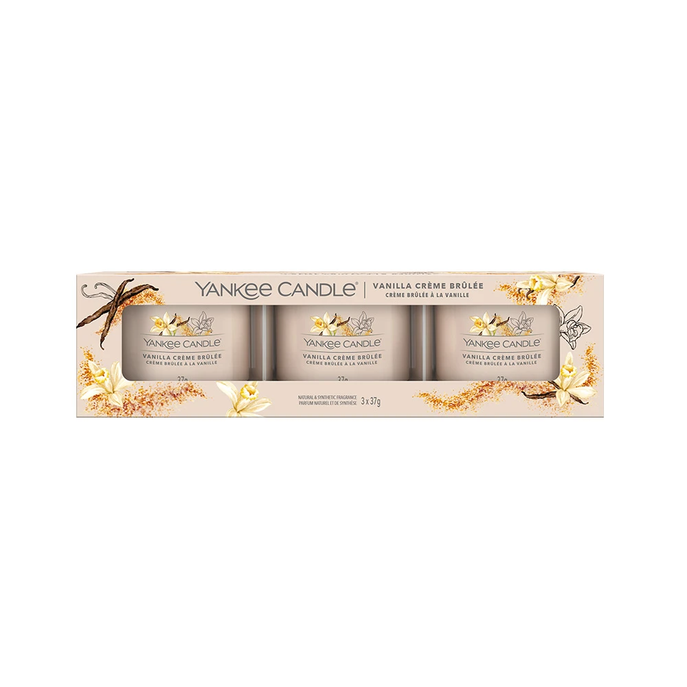 Le Candele Votive in Vetro Vanilla Crème Brûlée della Linea Signature di Yankee Candle vi farà assaporare una dolce tentazione. La sua Fragranza Dolce & Speziata richiama il profumo della crema pasticcera e le note delle praline caramellate e della cannella.