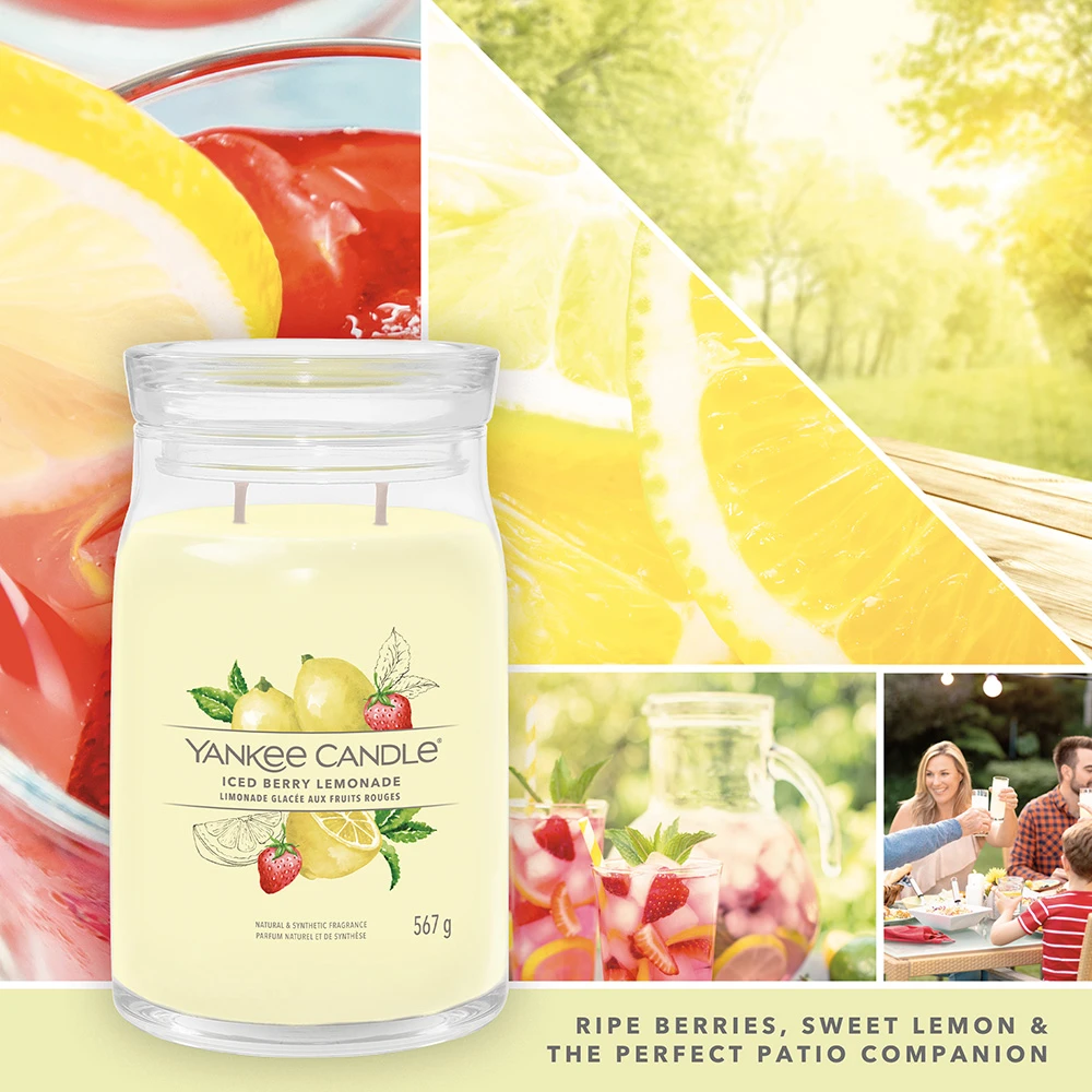 La Giara Grande Iced Berry Lemonade della Linea Signature di Yankee Candle richiama il profumo di un bicchiere di limonata rosa fredda in una calda giornata estiva. La Fragranza Fruttata evoca la profumazione dello zucchero e del limone che si amalgamano con le note del pompelmo rosso e del pomelo.