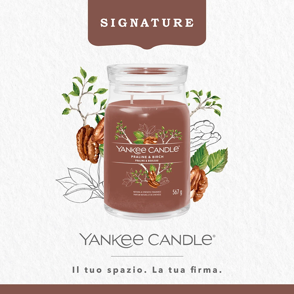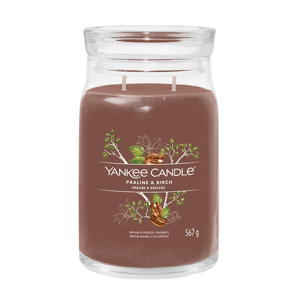 La Giara Grande Praline & Birch della Linea Signature di Yankee Candle richiama l’aroma del legno di betulla, dei chiodi di garofano e della cannella. La sua Fragranza Dolce e Speziata dalle note calde ispirate alle praline ti donerà la dolce sensazione di una serata accanto al falò.