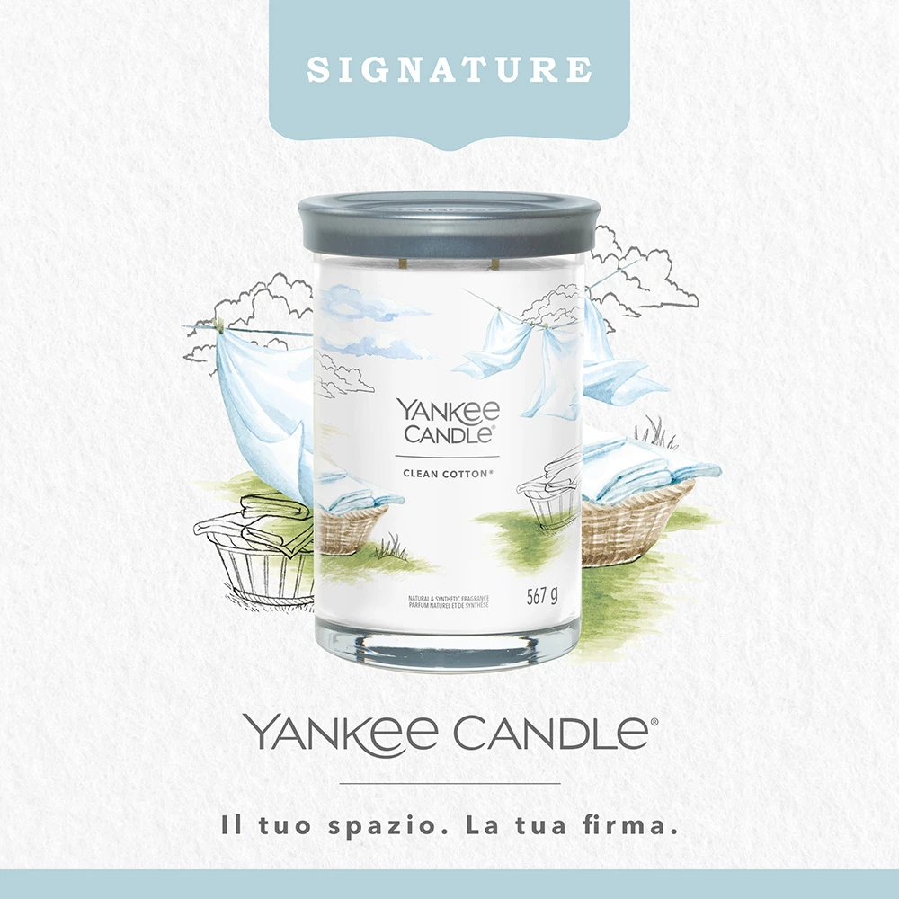Il Tumbler Grande Clean Cotton della Linea Signature di Yankee Candle richiama il profumo del cotone asciugato al sole. Clean Cotton è una Fragranza Fresh & Clean ispirata a note verdi, fiori bianchi e un pizzico di limone.
