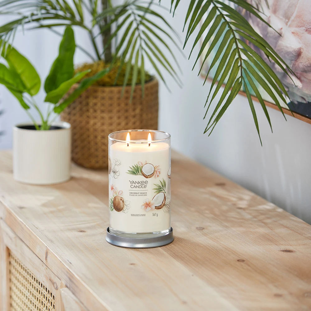 Il Tumbler Grande Coconut Beach della Linea Signature di Yankee Candle ti porta su una spiaggia tropicale. La sua Fragranza Fresh & Clean è ispirata ad un paradiso ai tropici, con note che richiamano il cocco che mescolandosi con aromi ispirati all’ananas e alla vaniglia di Tahiti crea un perfetto mix esotico.