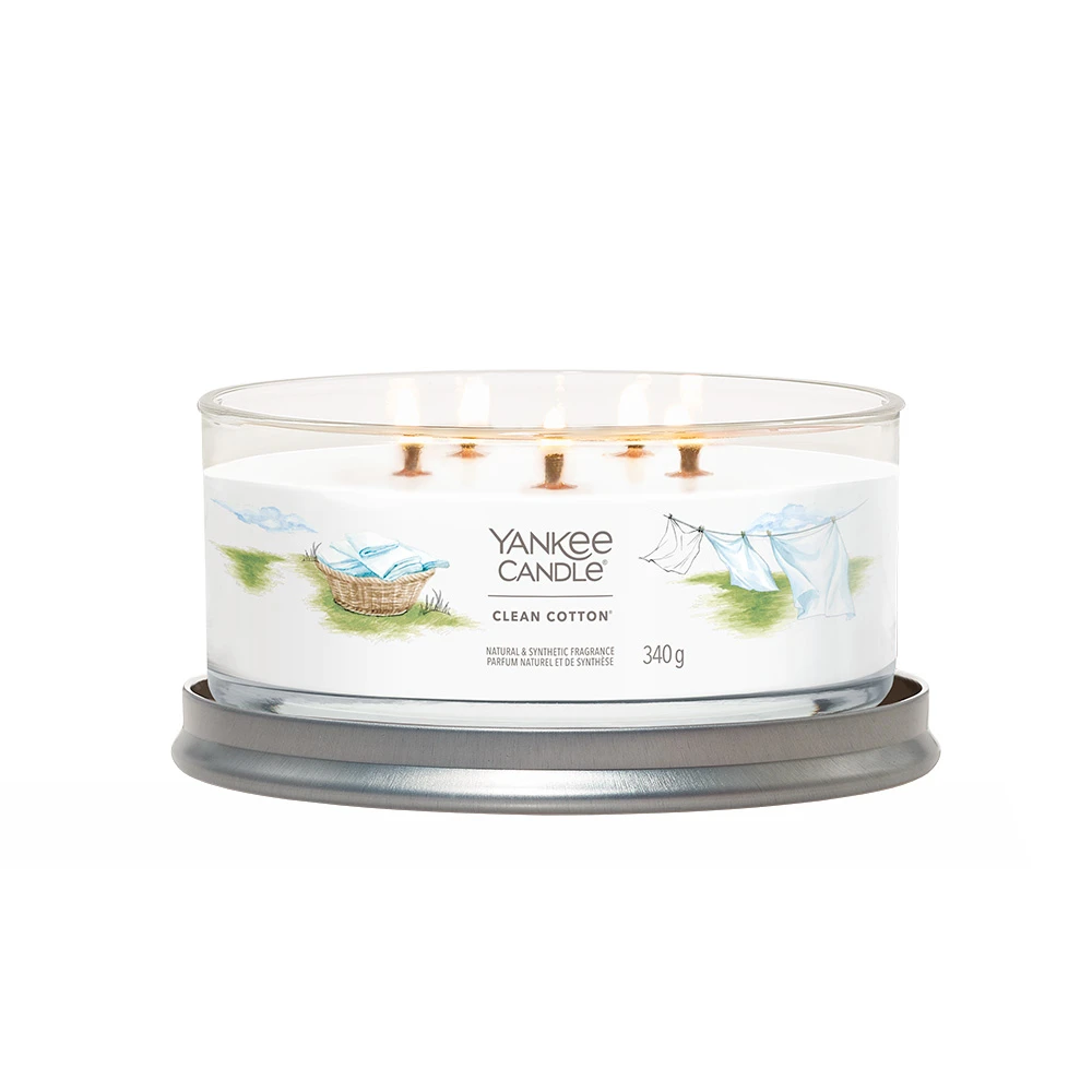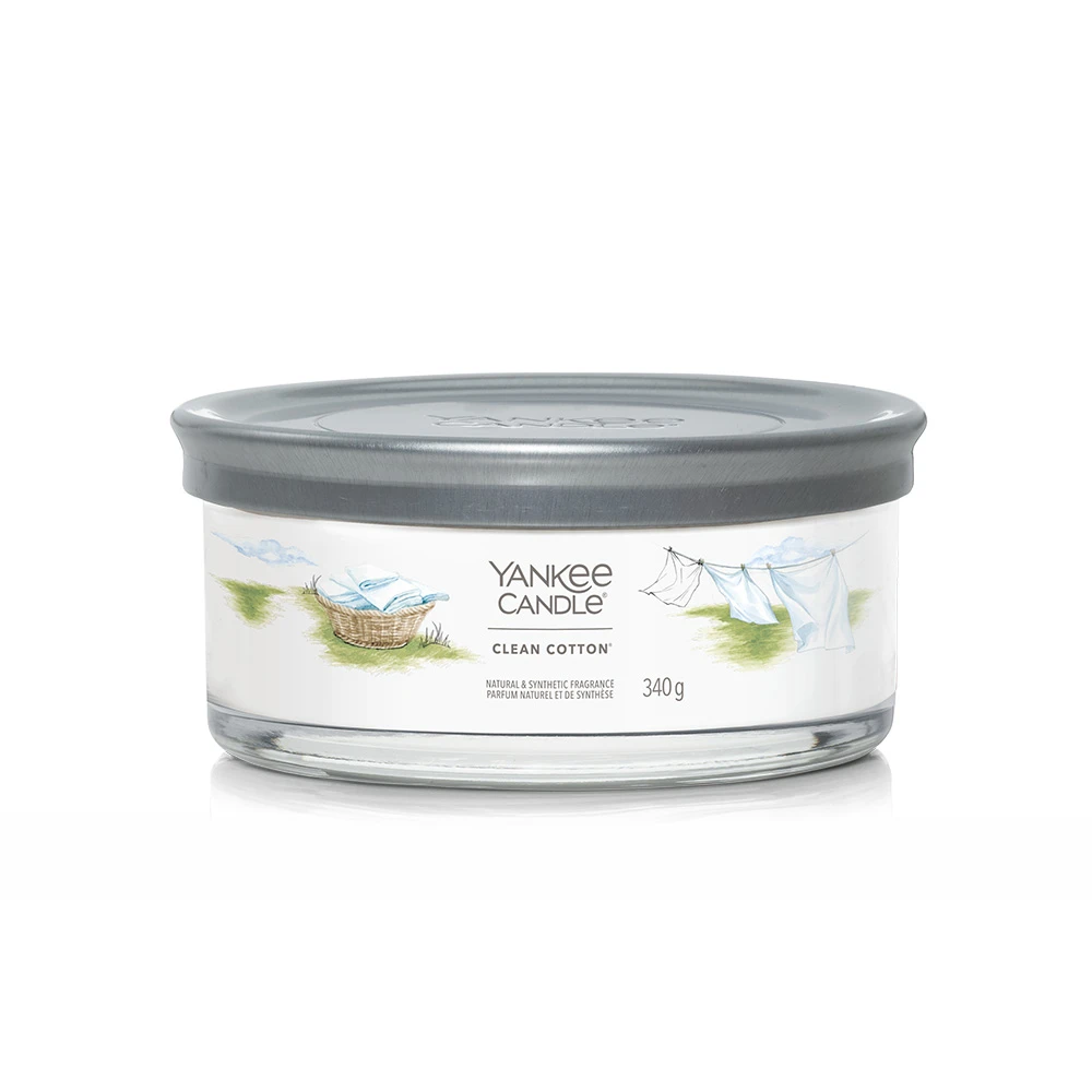 Il Tumbler Multi-Stoppino Clean Cotton della Linea Signature di Yankee Candle richiama il profumo del cotone asciugato al sole. Clean Cotton è una Fragranza Fresh & Clean ispirata a note verdi, fiori bianchi e un pizzico di limone.