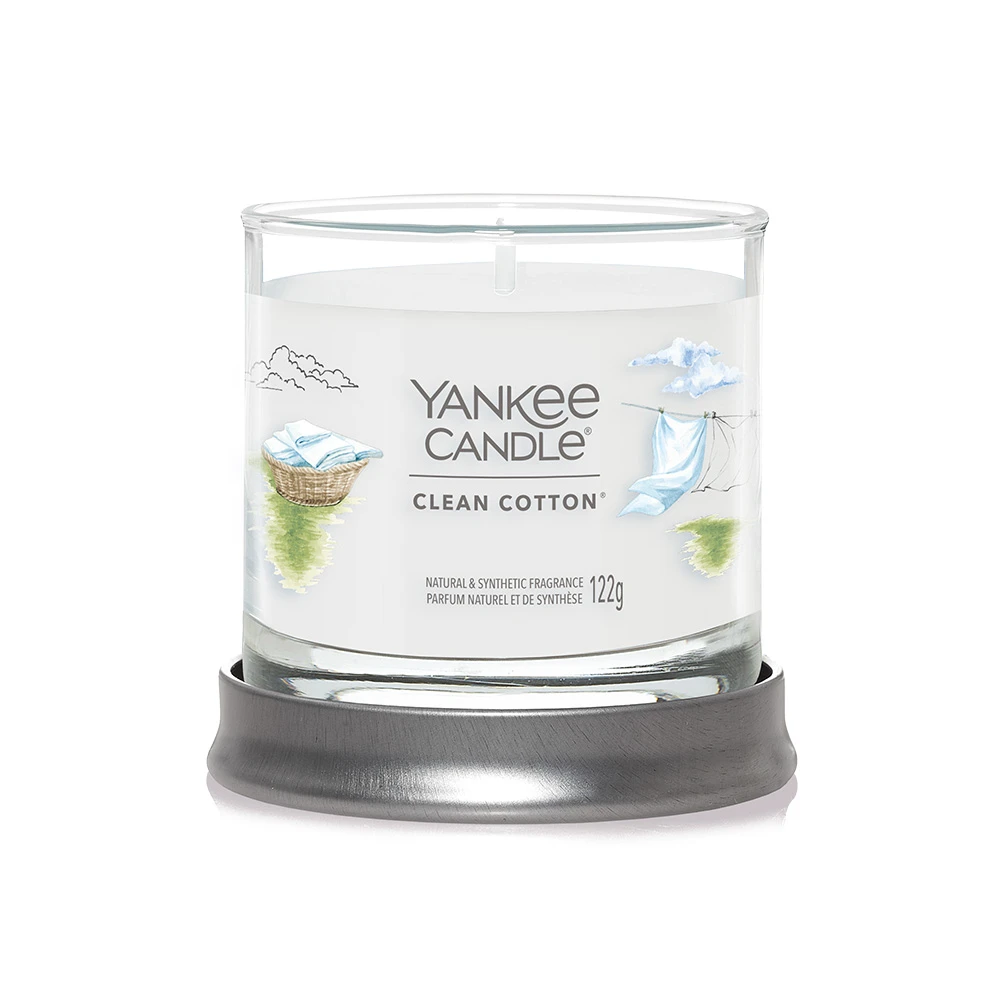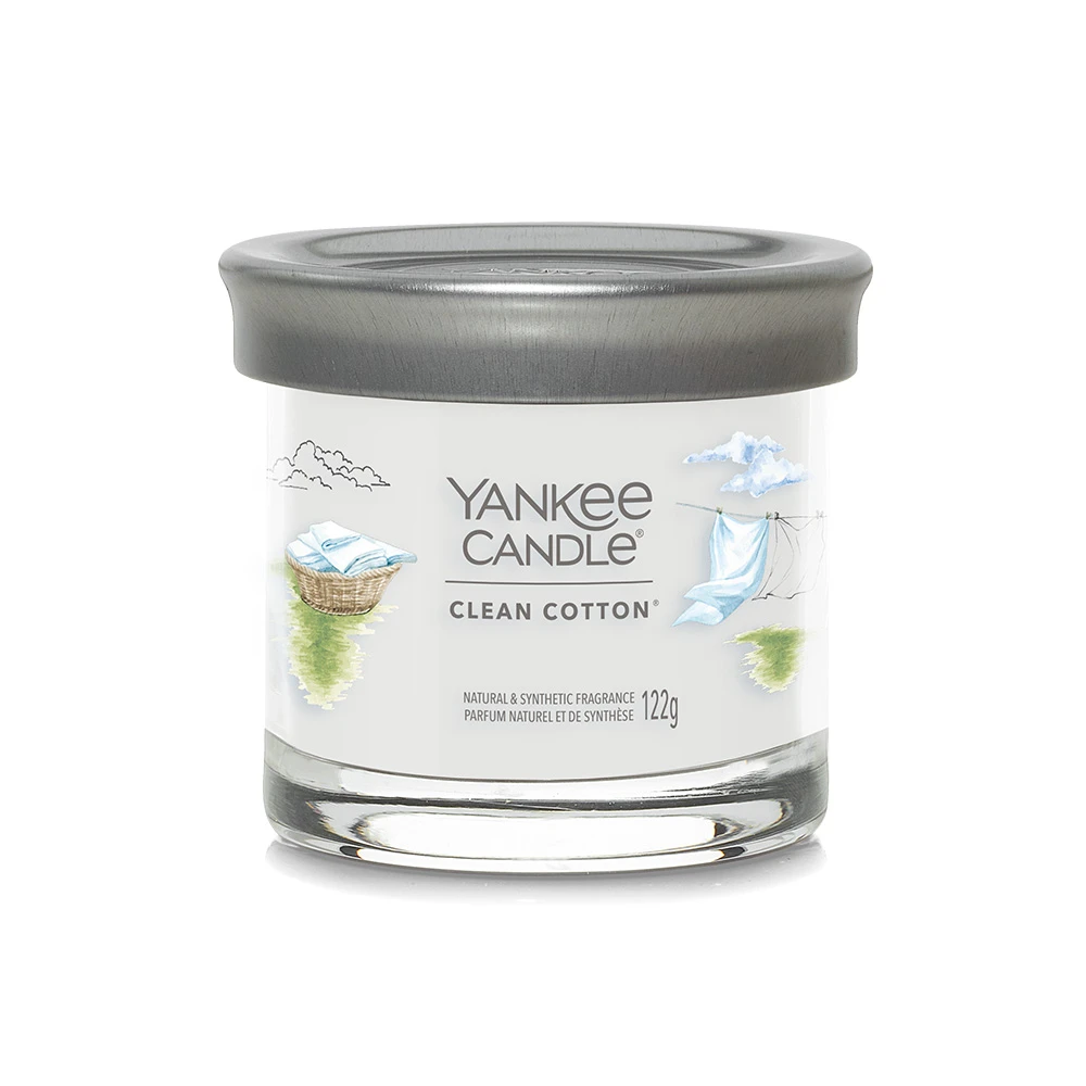 Il Tumbler Piccolo Clean Cotton della Linea Signature di Yankee Candle richiama il profumo del cotone asciugato al sole. Clean Cotton è una Fragranza Fresh & Clean ispirata a note verdi, fiori bianchi e un pizzico di limone.