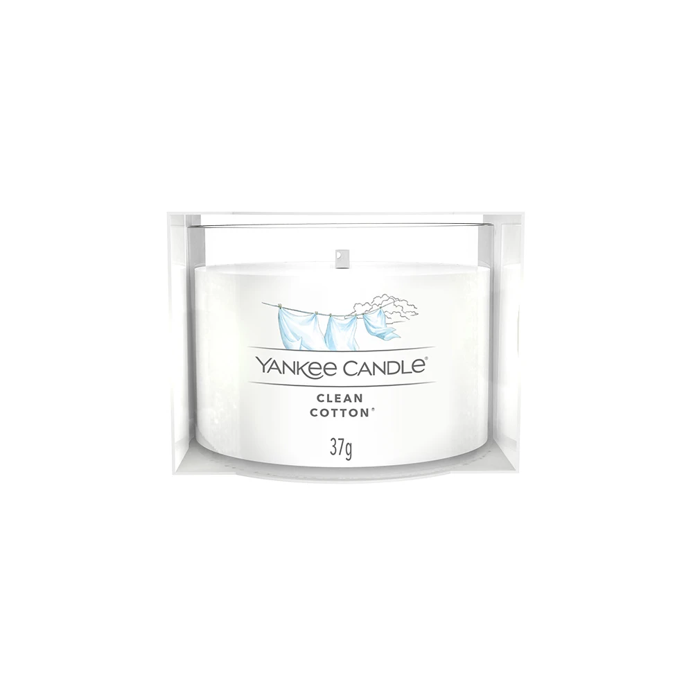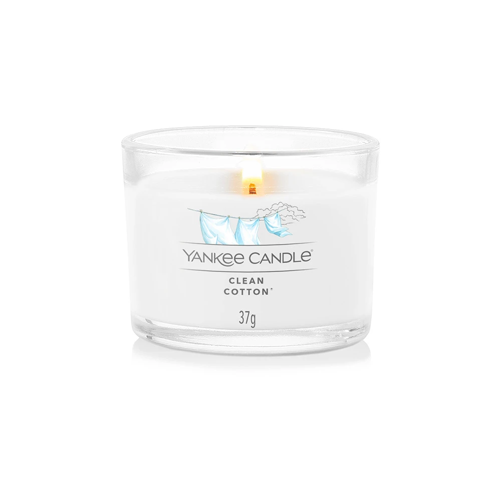 La Candela Votiva in Vetro Clean Cotton della Linea Signature di Yankee Candle richiama il profumo del cotone asciugato al sole. La sua Fragranza Fresh & Clean è ispirata a note verdi, fiori bianchi e un pizzico di limone.
